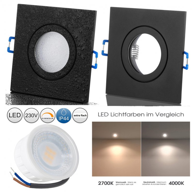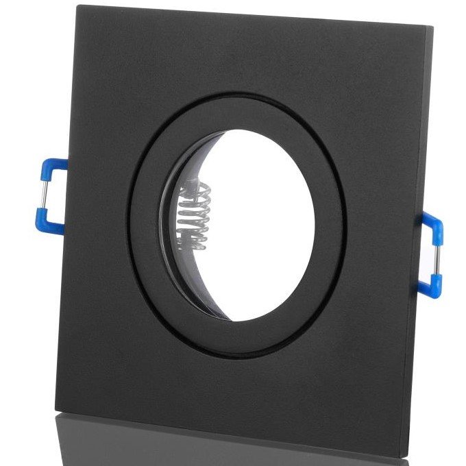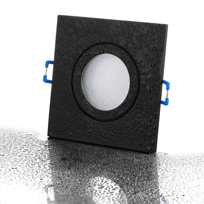 --Hochwertiger Alu Einbaurahmen eckig schwarz --Farbe: Schwarz-Matt --Form: viereckig/Quadrat --Befestigung des Leuchtmittels via Klickverschluss --Starr/nicht schwenkbar wegen IP44 --Lochmaß/Deckenausschnitt: 57-87mm --Aussendurchmesser/Max. Abdeckmaß: 90x90mm --Schutzklasse IP44 (Feuchtraum geeignet) --Erhöhte Beständigkeit gegen Spitzwasser, Staub & Feuchtigkeit --Einbautiefe: extra flach NUR 30mm